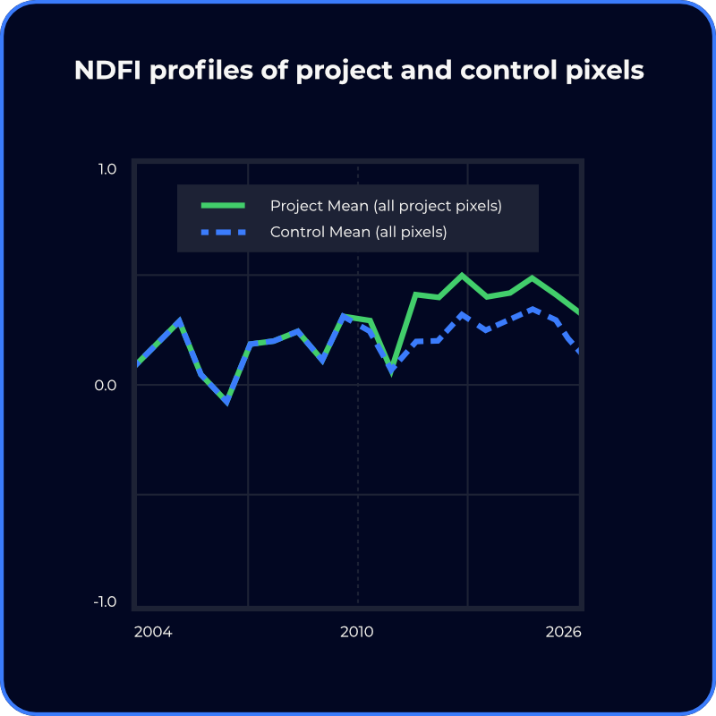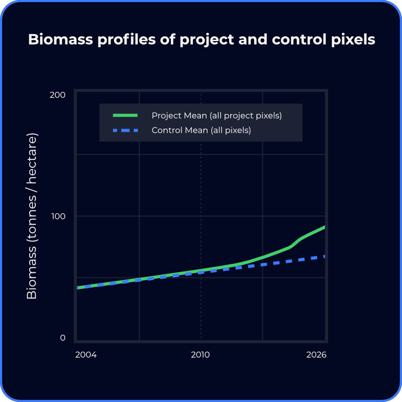 Chloris direct biomass estimation captures stable biomass growth trends (figure 1) and eliminates the seasonal noise and saturation effects inherent in vegetation indices (figure 2), resulting in stable Stocking Index slopes and consistent Performance Benchmarks (figure 3) that reduce uncertainty and support confident credit issuance.